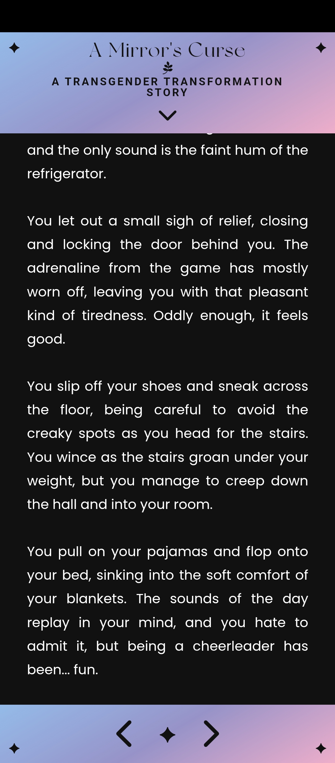 Happy one year! Mirror's Curse has quickly become one of my favorites in the IF genre and I'm super excited to see what the next year brings. It's lovely to have some transgender joy in this world considering what's happening right now and I'm very grateful for your work.